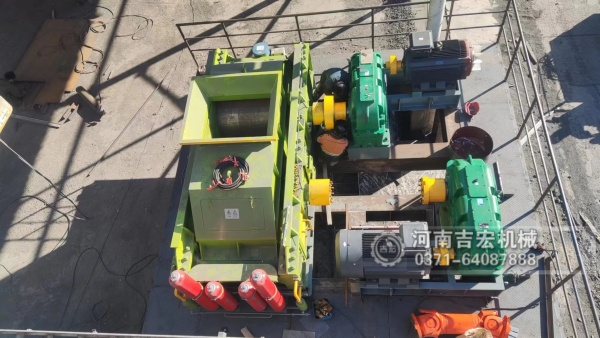 供料:石料首先被送入對輥破碎機的兩個輥輪之間。