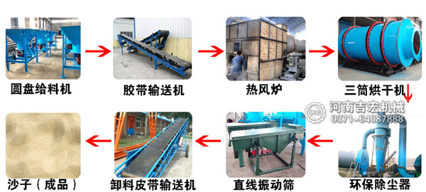 石英砂先經(jīng)過圓盤給料機被均勻地送入到皮帶輸送機之上,之后通過流沙管進入到烘干機內(nèi)部,熱風爐內(nèi)燃料的燃燒產(chǎn)生的熱量在抽風機的作用下進入到主機內(nèi)與沙子進行接觸,完成熱量的傳遞,快速蒸發(fā)水分。我公司生產(chǎn)的沙子烘干機是三回程密封結構,能夠很好的降低熱量的散失,提高熱效率。干燥之后的沙子輸送到直線振動篩進行篩分,之后被提升機送入儲料罐進行儲存或者進行打包裝袋。在接料斗的上部是排放工藝流程之中的塵土等,經(jīng)過除塵系統(tǒng)處理之后,能夠很好的達到環(huán)保的目的。